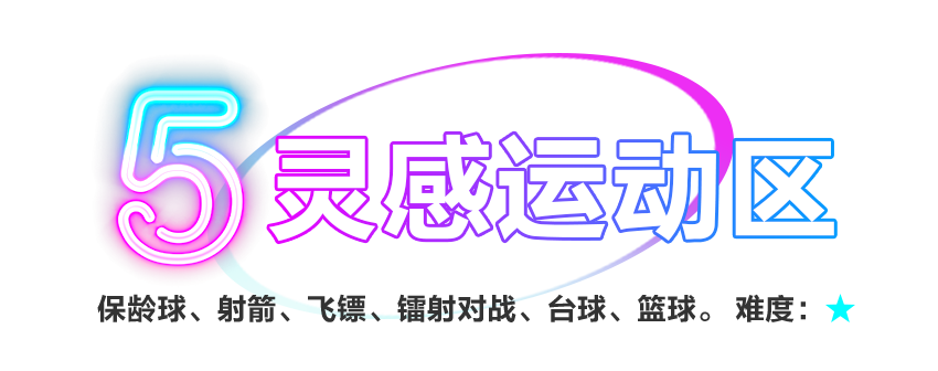 保齡球、情景射箭、鐳射對戰(zhàn)、真人CS、曲棍球、臺球、籃球、飛鏢等項目將體育項目與環(huán)境特效良好結(jié)合,帶來煥然一新的視覺體驗。